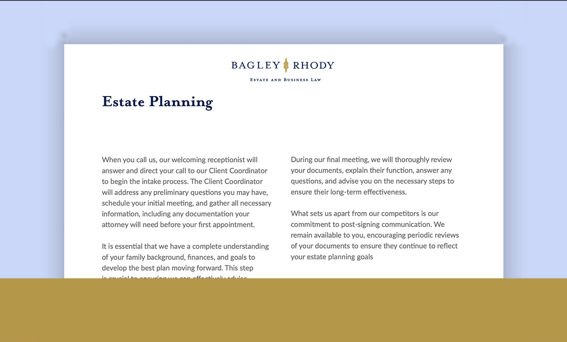 Following the consultation, your attorney will provide you with a summary, recommendations, and an engagement letter should you desire to move forward with the proposed work. Any substantive time we have spent, including the initial consultation, review of documents, or other work prior to the meeting will be billed on either an hourly basis or as part of a flat fee. If a consultation fee has been paid, it will be credited on the first invoice. If you choose not to move forward, there is no charge, other than the consultation fee if already paid. Our goal is to know as much as possible at the time of your initial consultation to allow it to be as informative and productive as possible.