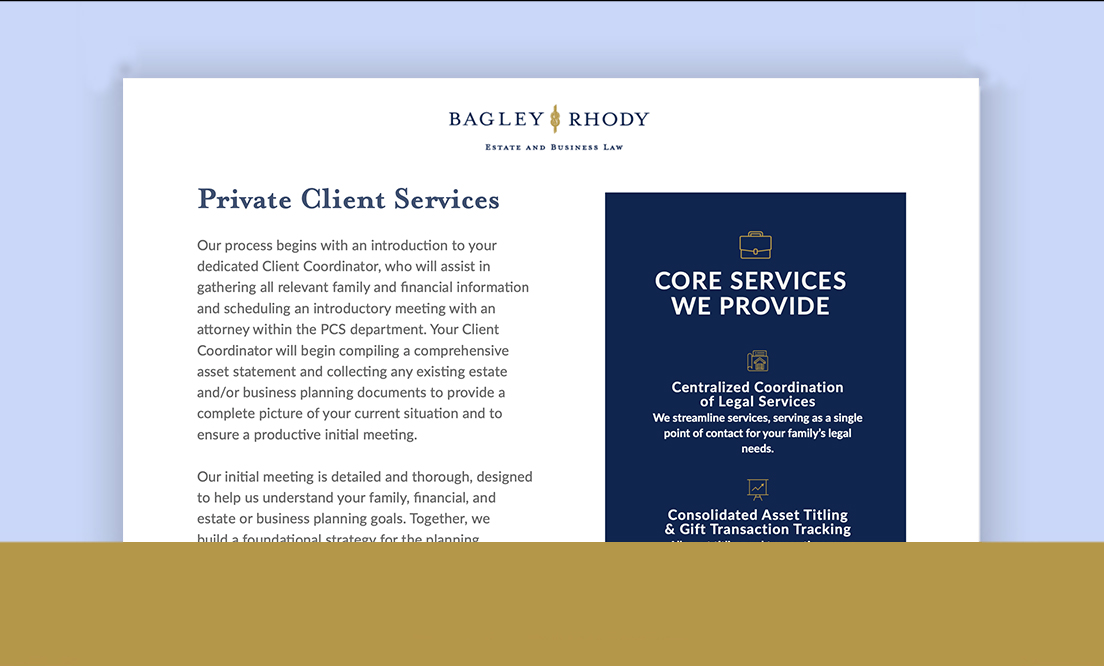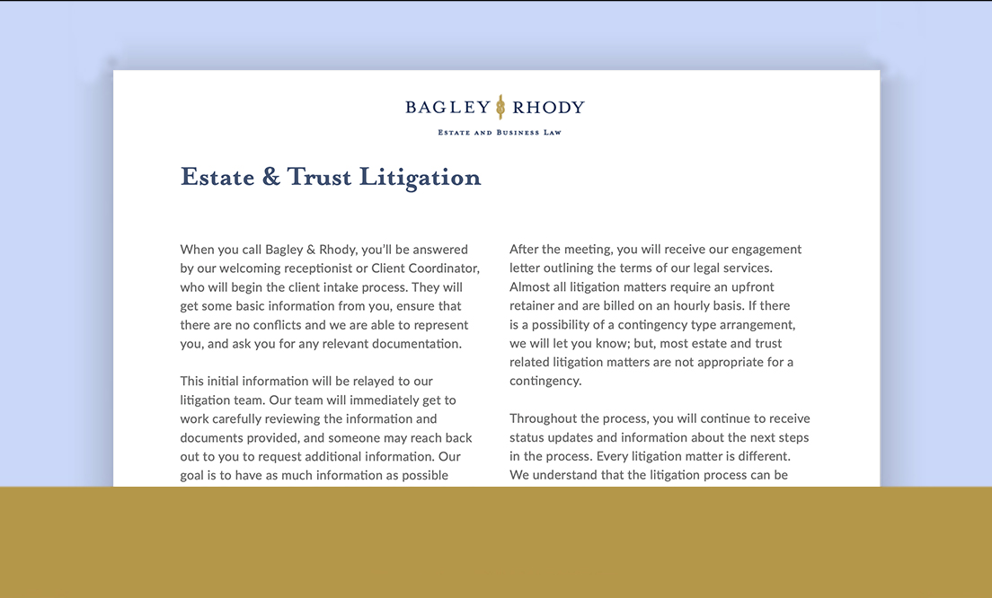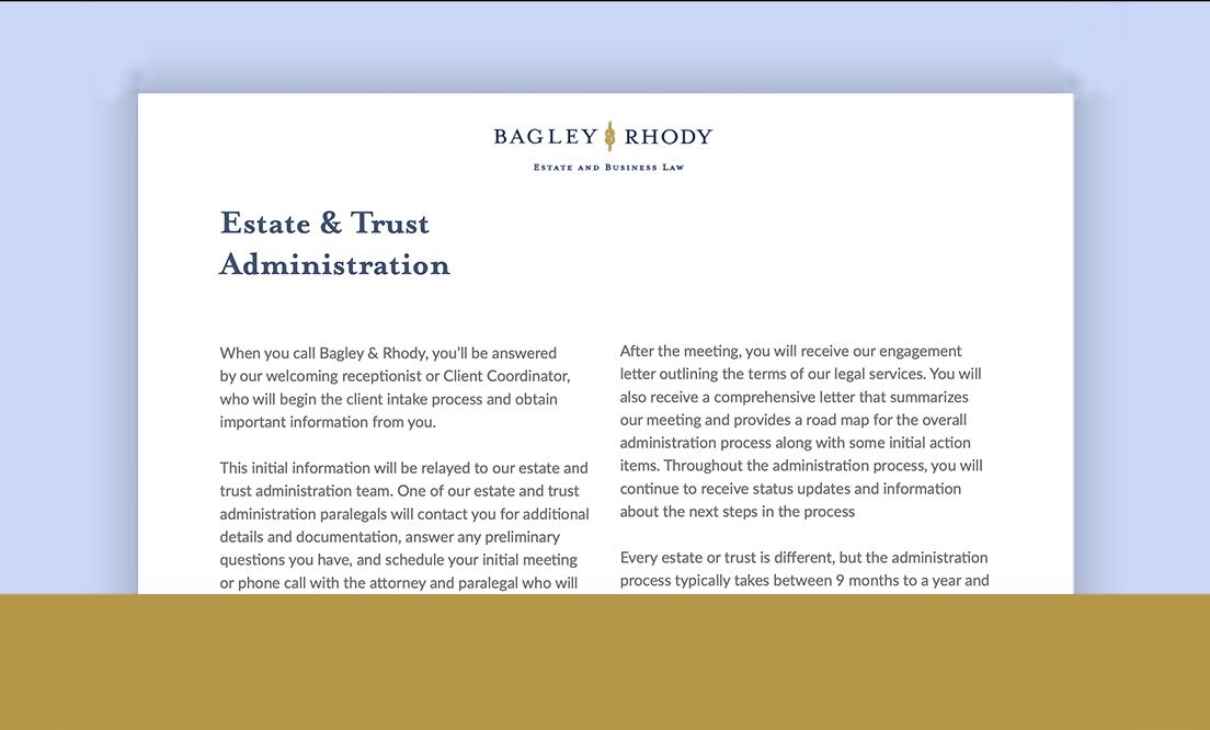 Prior to the initial consultation, we strive to know as much as possible about your needs. Thoughtful review and advance preparation are our way of ensuring we provide you with a comprehensive consultation that is both productive and reassuring. The practice area will gather preliminary information, request additional documentation from you as needed, and assist with scheduling a consultation with the appropriate attorney.